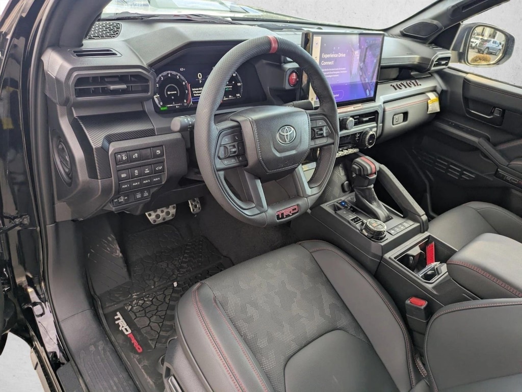 • Trd pro leather-trimmed manual tilt/telescopic steering wheel with trd badge, red center stripe, and phone, audio, display/infotainment, and driver assist controls.